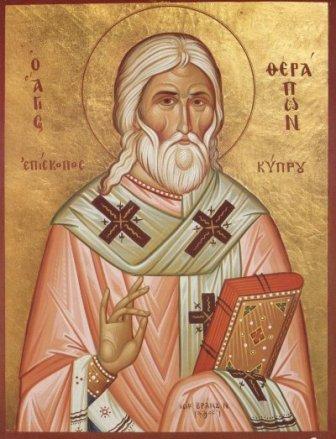 Μετά από πολλά χρόνια, έγινε επιδρομή των Αράβων στην Κύπρο, οι οποίοι κατέκαυσαν όλα τα Μοναστήρια και τις Εκκλησίες και έσφαξαν πολλούς κατοίκους του νησιού. Και τον Άγιο Θεράποντα τον συνέλαβαν στην Εκκλησιά και τον αποκεφάλισαν μπροστά στην αγία Τράπεζα την ώρα που λειτουργούσε. Ξαφνικά, μόλις έγινε αυτό, ουράνιες μελωδίες και ένα Άκτιστο Φώς κύκλωσε όλο τον χώρο της Αγίας Τράπεζας. Αυτό το θέαμα στους πιστούς τους έδωσε δύναμη, ενώ στους Άραβες προκάλεσε φόβο και τύψεις για αυτό που έκαναν. Το σώμα του Αγίου Θεράποντος του Ιερομάρτυρα κηδεύτηκε από τους πιστούς, όπου και χτίστηκε ο πρώτος Ναός του.