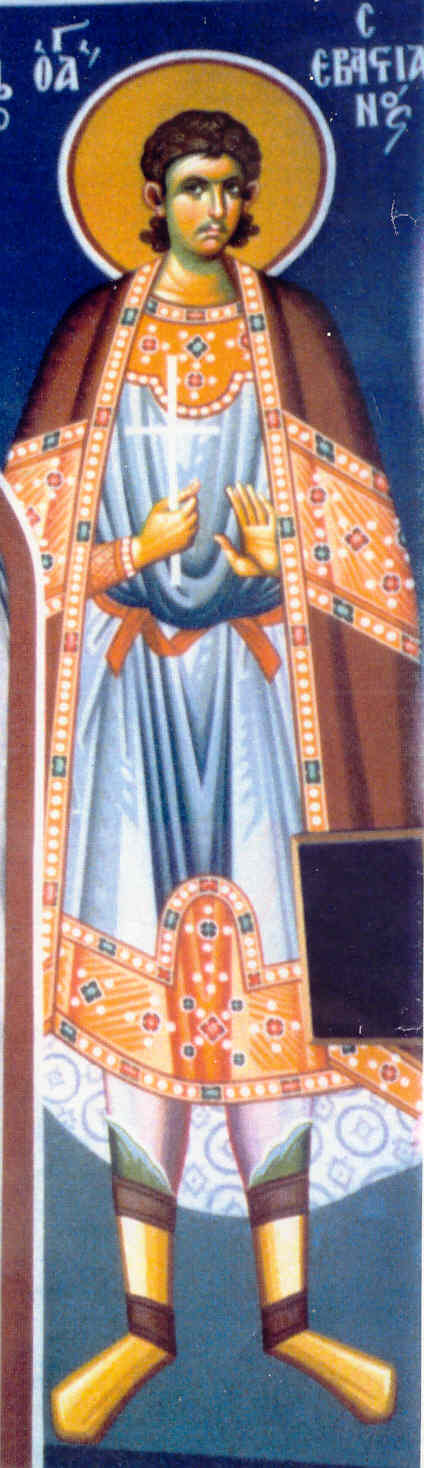 Τῆς εὐσεβείας διαπρέπων τῷ ζήλῳ, μαρτυρικὸν συνασπισμὸν συναγείρεις, ὧν ἐν τῷ μέσῳ ἤστραψας ὡς ἄστρον φαεινόν• ὅθεν καὶ τοῖς βέλεσιν, οἷς ἐτρώθης