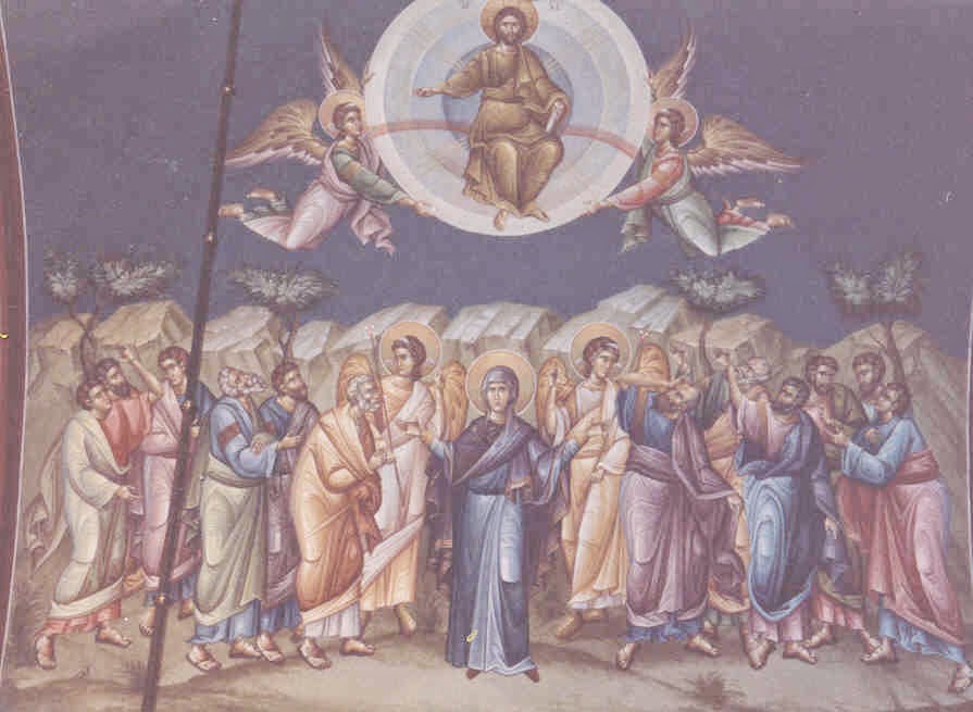 «Εἶπε δέ ὁ Κύριος πρός αὐτούς. Λήψεσθε δύναμιν ἐξ ὕψους, ἐπελθόντος τοῦ ἁγίου Πνεύματος ἐφ᾽ ὑμᾶς καί ἔσεσθαί μοι μάρτυρες ἔν τε Ἱερουσαλήμ καί ἐν πάσῃ τῇ Ἰουδαίᾳ καί Σαμαρείᾳ καί ἕως ἐσχάτου τῆς γῆς. Ἐξήγαγε δέ αὐτούς ἔξω ἕως τήν Βηθανίαν καί ἐπάρας τάς χεῖρας αὑτοῦ, εὐλόγησεν αὐτούς. Καί ἐγένετο ἐν τῷ εὐλογεῖν αὐτόν αὐτούς, διέστη ἀπ᾽ αὐτῶν καί ἀνεφέρετο εἰς τόν οὐρανόν… Βλεπόντων αὐτῶν ἐπῄρθη καί νεφέλη ὑπέλαβεν αὐτόν ἀπό τῶν ὀφθαλμῶν αὐτῶν. Καί ὡς ἀτενίζοντες ἦσαν εἰς τόν οὐρανόν, πορευομένου αὐτοῦ, καί ἰδού ἄνδρες δύο παρειστήκεισαν αὐτοῖς ἐν ἐσθῆτι λευκῇ, οἵ καί εἶπον. Ἄνδρες Γαλιλαῖοι, τί ἑστήκατε ἐμβλέποντες εἰς τόν οὐρανόν; Οὗτος ὁ Ἰησοῦς, ὁ ἀναληφθείς ἀφ᾽ ὑμῶν εἰς τόν οὐρανόν, οὕτως ἐλεύσεται πάλιν, ὅν τρόπον ἐθεάσασθε αὐτόν πορευόμενον εἰς τόν οὐρανόν. Τότε ὑπέστρεψαν εἰς Ἱερουσαλήμ – μετά χαρᾶς μεγάλης – ἀπό ὄρους τοῦ καλουμένου Ἐλαιῶνος. Καί ἦσαν διαπαντός ἐν τῷ ἱερῷ αἰνοῦντες καί εὐλογοῦντες τόν Θεόν».
